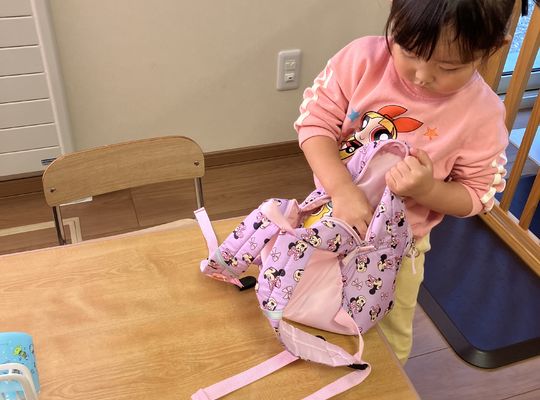 2025/10/27 石川園朝の活動時間前に、2歳児さんはお給食の準備をします♫ リュックからエプロンやスプーン・フォークを自分で取り出し、 テーブルに置きます。一つ一つ丁寧に並べる... -