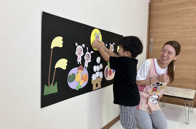 先生の紙芝居を見たり、まあるいお月様の中にウサギがいるかも…というお話に目をキラキラと輝かせて聞いていた子どもたちです(*^-^*)