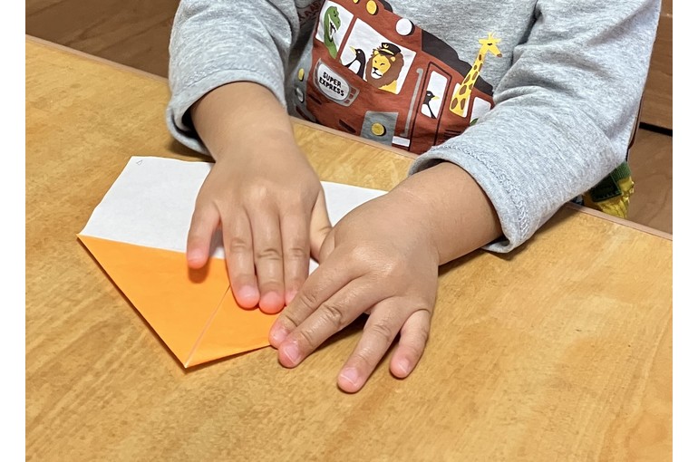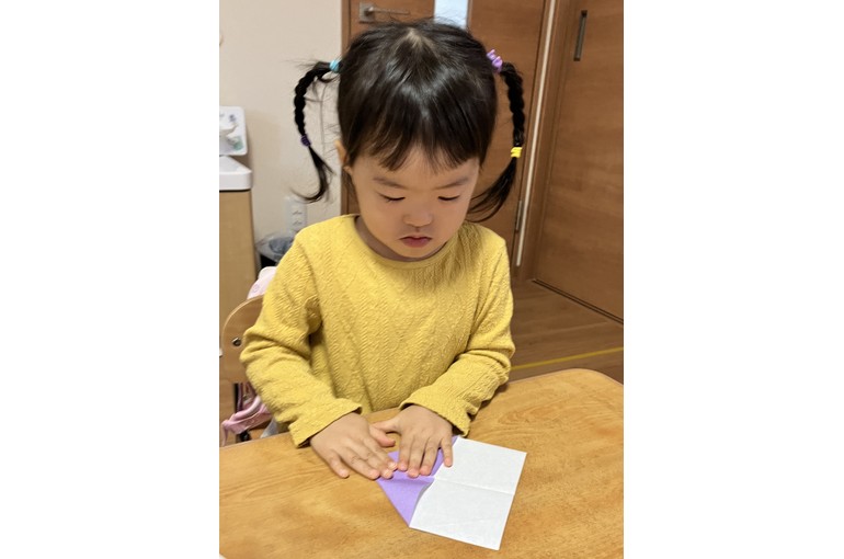 折り紙では、保育士の折り方を見て折ったり、印を付けてもらって同じマークを合わせて折ったりして、手先を一生懸命に使って作っていた2歳児さん。