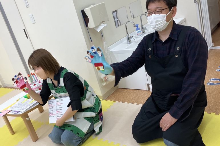 先生からの出し物は「おはなしゆびさん」の手袋シアターで、みんなノリノリで歌っていました!
