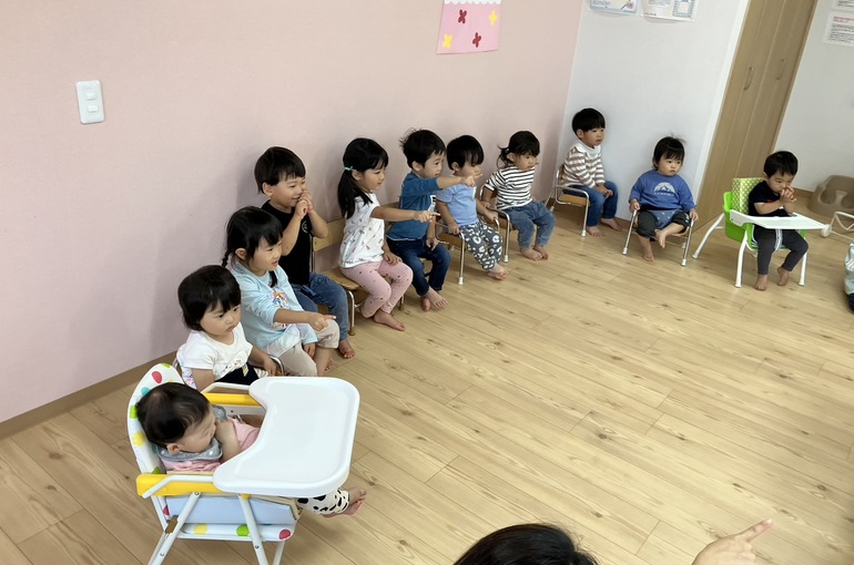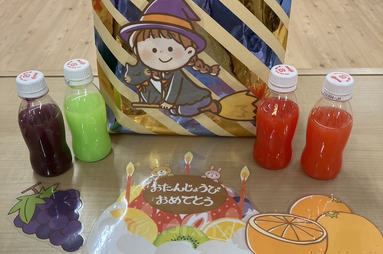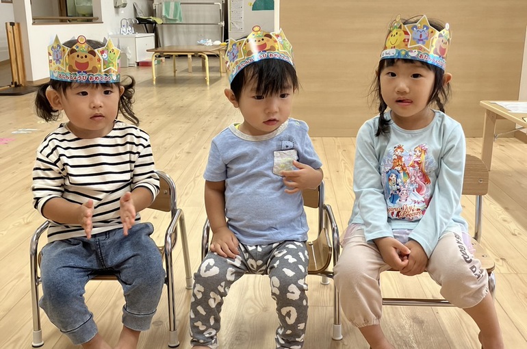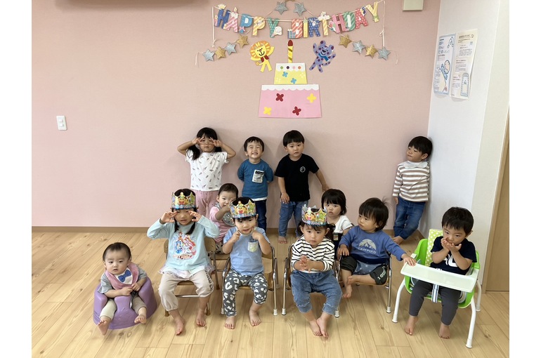 みんなの前に立つと、緊張のせいか、かたまってしまったようですが、お祝いをしてもらうとにこにこ♡